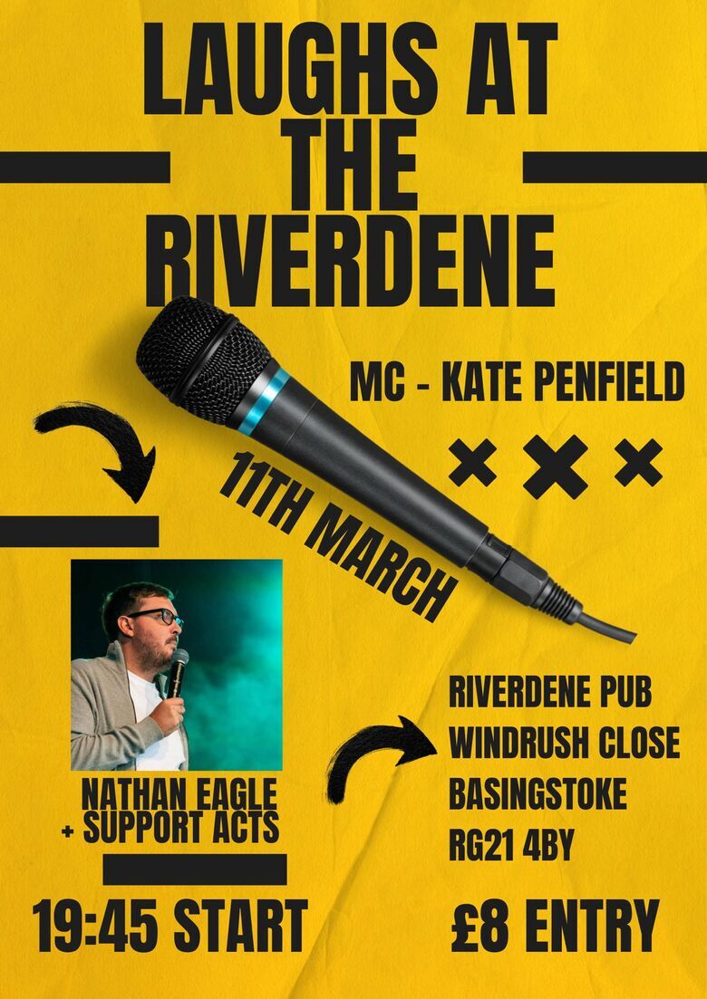 Laughs at the Riverdene is bringing top-tier comedy to Basingstoke for a night of big laughs and great vibes. Hosted by the brilliant Kate Penfield, the evening features headliner Nathan Eagle alongside a lineup of hilarious support acts, delivering sharp stand-up and crowd-pleasing jokes in an intimate pub setting.