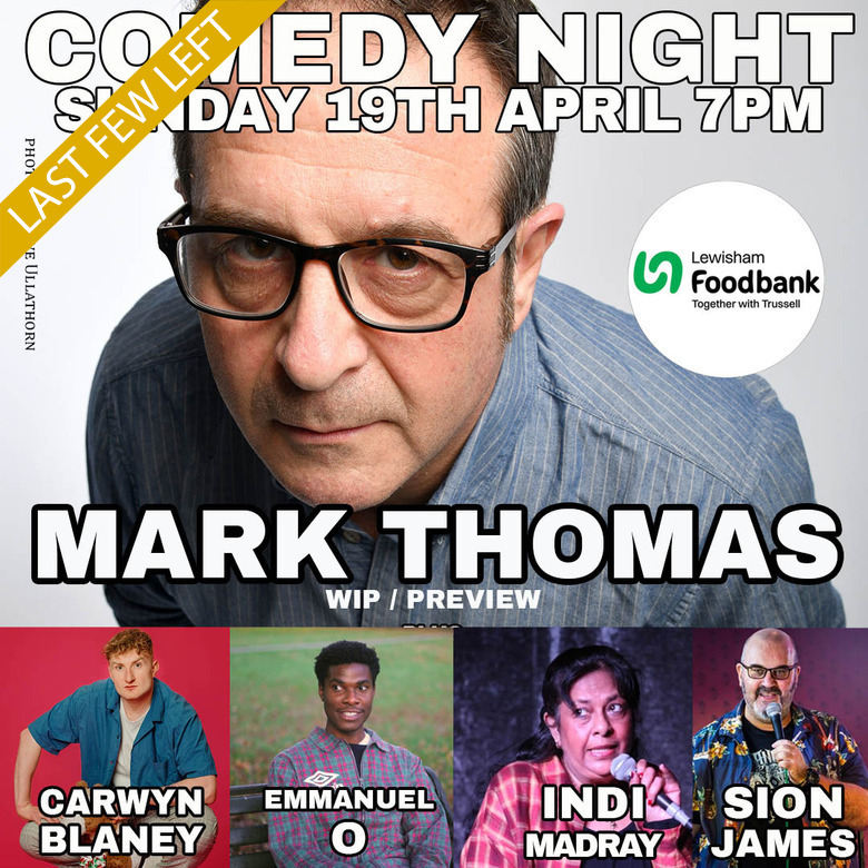 Don't miss chance to see a work in progress from the UK's finest political comedian , none other than the legendary Mark Thomas! South London's finest -Probably best known for the political stunts as performed on his cult Channel 4 show, The Mark Thomas Comedy Product , cult BBC Radio comedy show The Mary Whitehouse Experience , BBC Radio 4 Manifesto shows and his many award winning touring theatre shows. Mark won 8 awards for performing, 3 for human rights work and 1 he invented for himself. “Thomas is a terrific performer and raconteur, and he has the gift of making an instant community out of a group of strangers.” – The Guardian