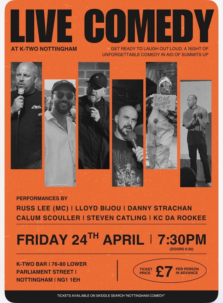 5 stand up comedian bring you a evening of laughter and entertainment at k-two (no-one) in Nottingham city centre, your evening will be hosted by Nottinghams own Russ lee with 5 comedians kc the rookie, Lloyd bijou , Danny Strachan , Stephen catling and Calum scouller