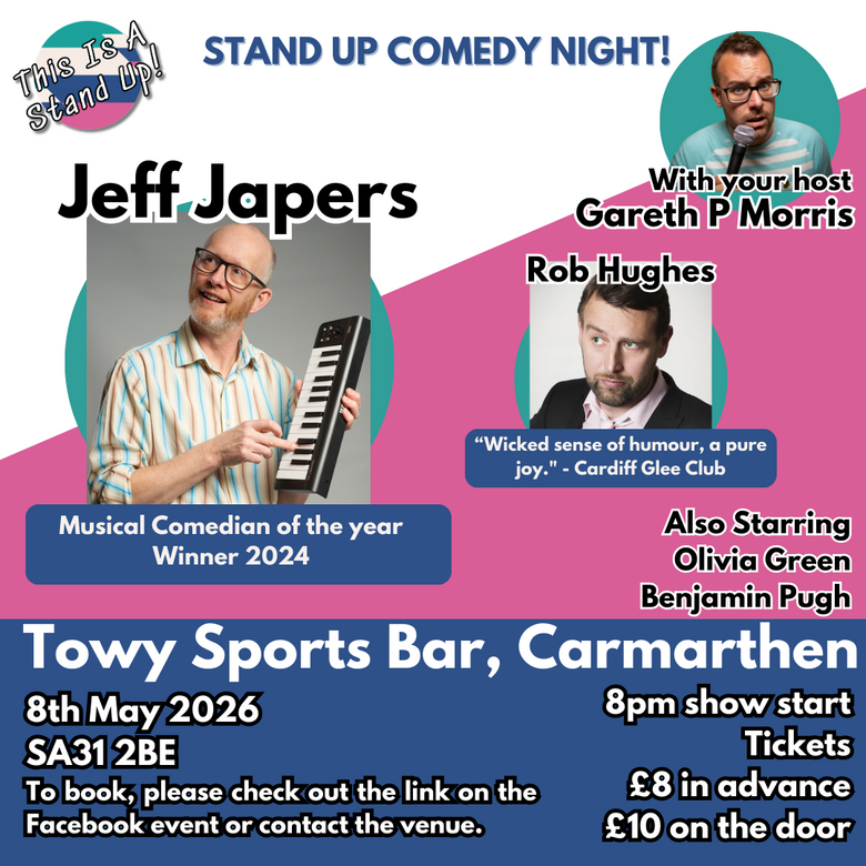Join us for a hilarious night of stand up comedy at Towy Sports Bar, Carmarthen! Headlined by Musical comedian of the year Jeff Japers!